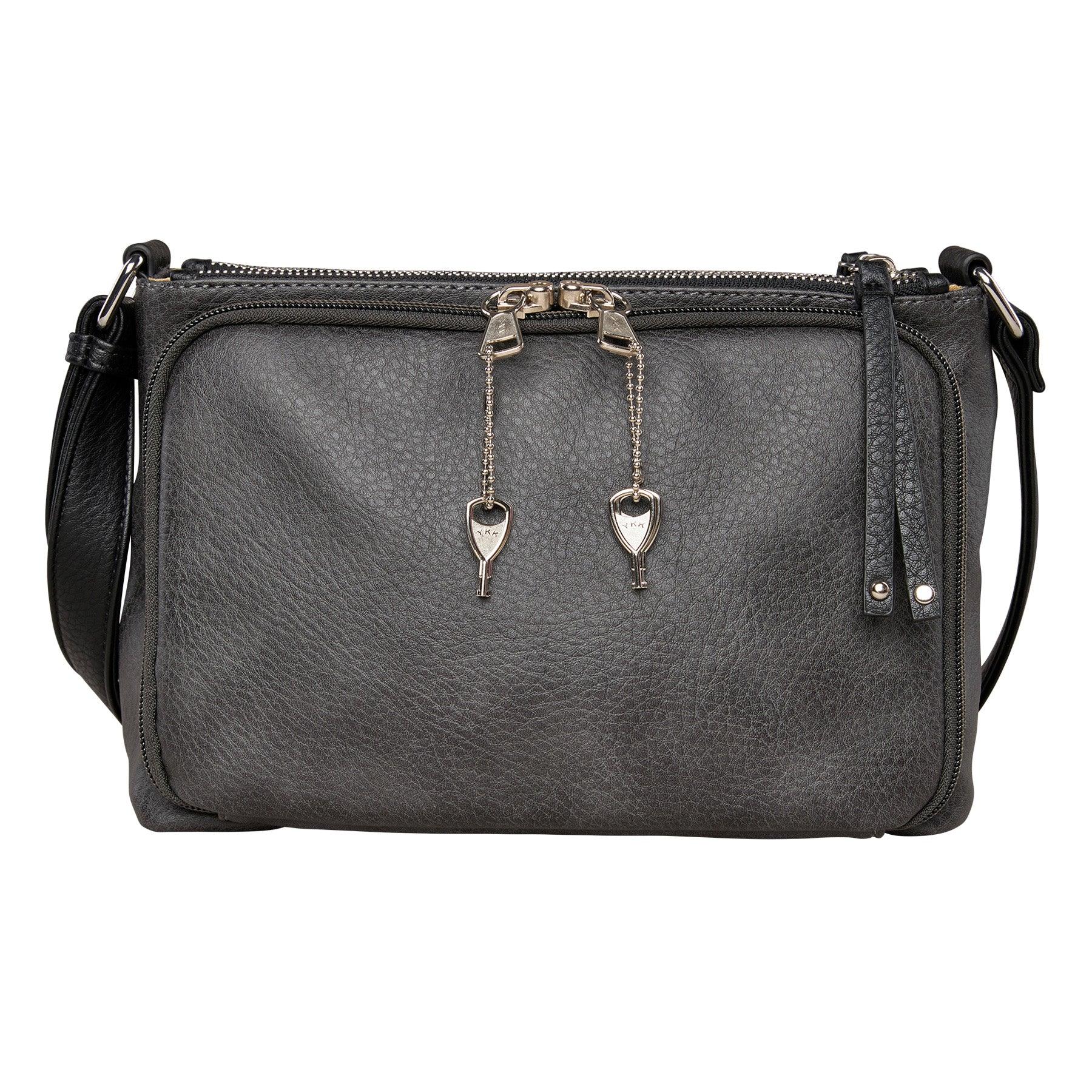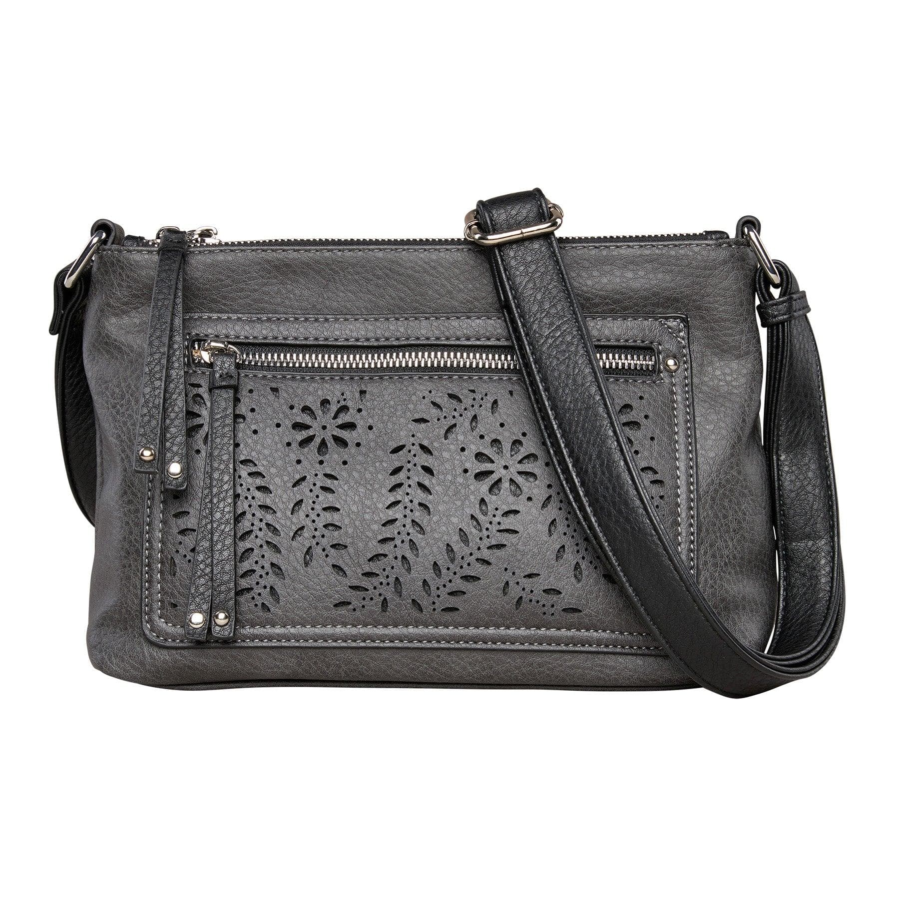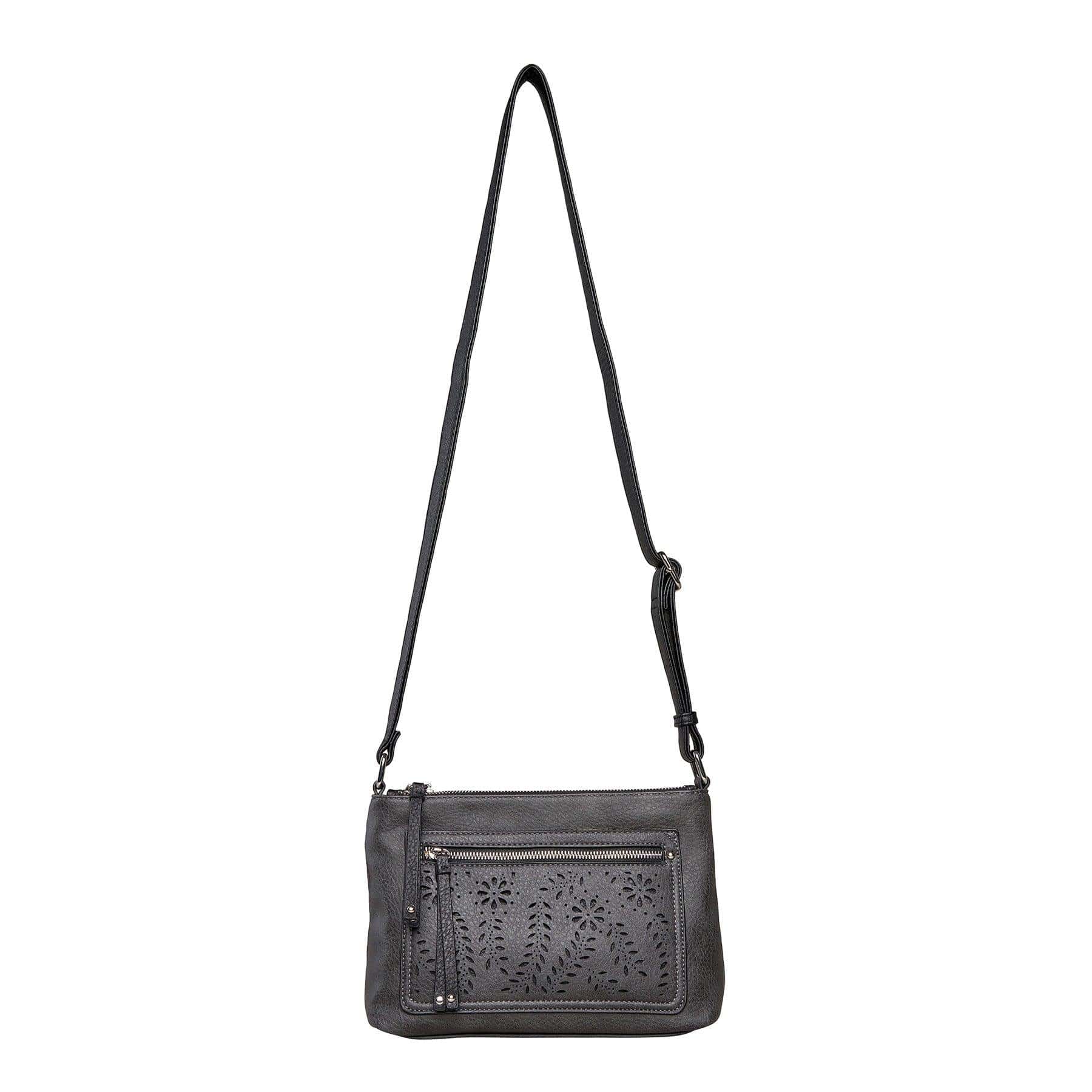 The Hailey Crossbody by Lady Conceal is crafted from soft faux leather with silver-tone hardware accents. The charming contrast trim and decorative laser cuts add beauty and allure. The Hailey boasts 3 main interior compartments: a front zip pocket with 2 slip pockets, a back zip pocket with one large zippered pocket, and a center compartment secured by magnets. In the center pocket, you'll find a zipper pocket, two slip pockets, and a key strap. Behind the laser cuts are two additional pockets, one with a magnetic closure for your cell phone and another zippered pocket. The adjustable crossbody strap measures 28”- 51” (drop 12.5”- 24.5”).