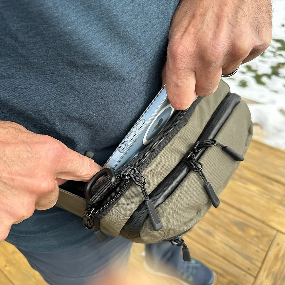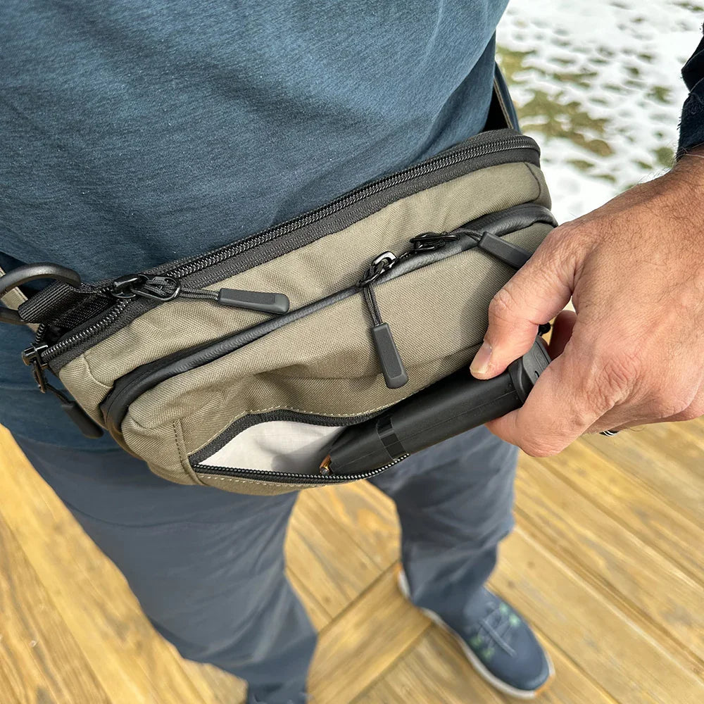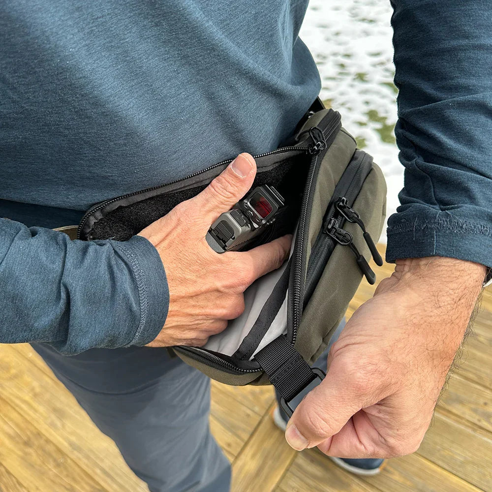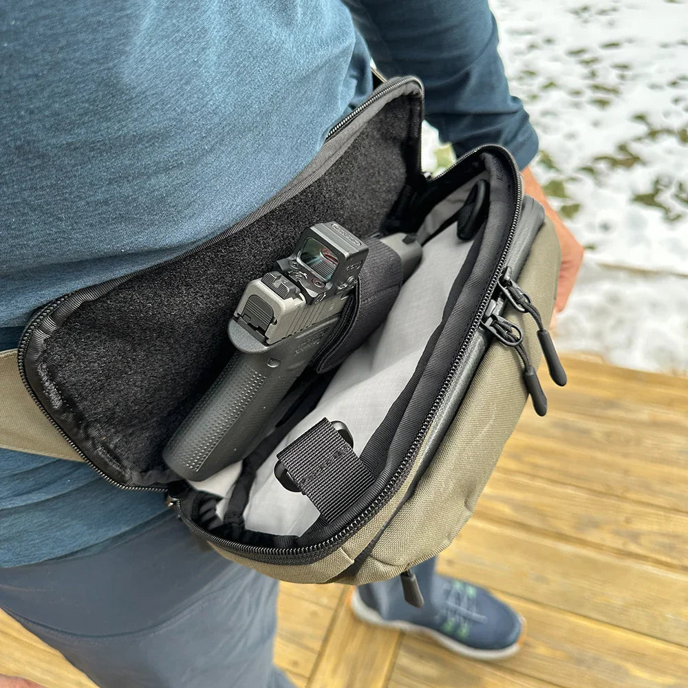 This versatile water resistant EDC waist pack doubles as a sling bag when desired, offering lightning fast CCW Access, functionality, convenience, and modularity for off body everyday carry.