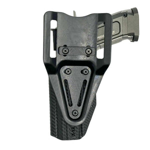 Our Outside the Waistband Competition Holster is designed for sport shooting. This holster has an adjustable retention and cant for the users preferred carry position. The lockable push button clip supports belts from 1.5" - 1.75" wide and has a Velcro patch to prevent sliding during competition setting. The holster mounting plate is designed to be supported by the leg and at the ready and allow freedom of movement on the run. The deep cut on the holster spine assist the user with fast draw and re-holstering.