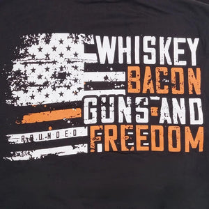 Express your love for the finer things in life with our Whiskey, Bacon, Guns, and Freedom short sleeve t-shirt. Crafted with comfort and style in mind, this shirt is perfect for any occasion. Made from high-quality materials, this shirt is soft to the touch and built to last. Whether you're out at the range, enjoying a barbecue with friends, or simply celebrating your love for freedom, this shirt is sure to make a statement. Available in a range of sizes, our Whiskey, Bacon, Guns, and Freedom t-short sleeve t-shirt is a must-have for anyone who values quality, comfort, and style. Order yours today and wear your passions proudly!
